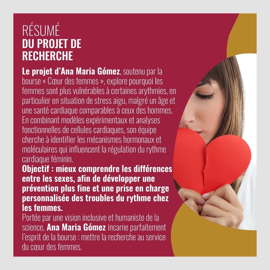 Lauréate 2025 de la bourse Danièle Hermann « Cœurs de femmes », Ana Maria Gómez explore une question cruciale : Pourquoi les femmes sont-elles plus vulnérables à certaines arythmies, surtout en situation de stress ?